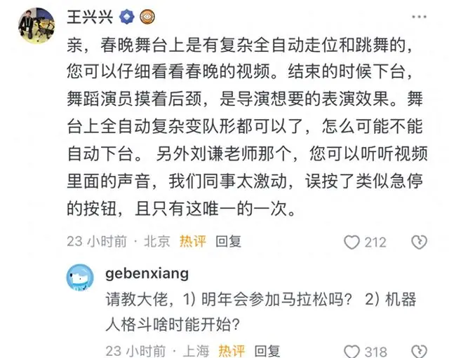 对于王兴兴的回应,有用户再次发表质疑,他认为王兴兴所说“舞蹈演员摸着后颈,是导演想要的表演效果”这一说辞“如果是真的,那么这个导演是不是想故意黑宇树公司?”王兴兴对此回应称,该动作是“为了好玩”“为了娱乐性”。